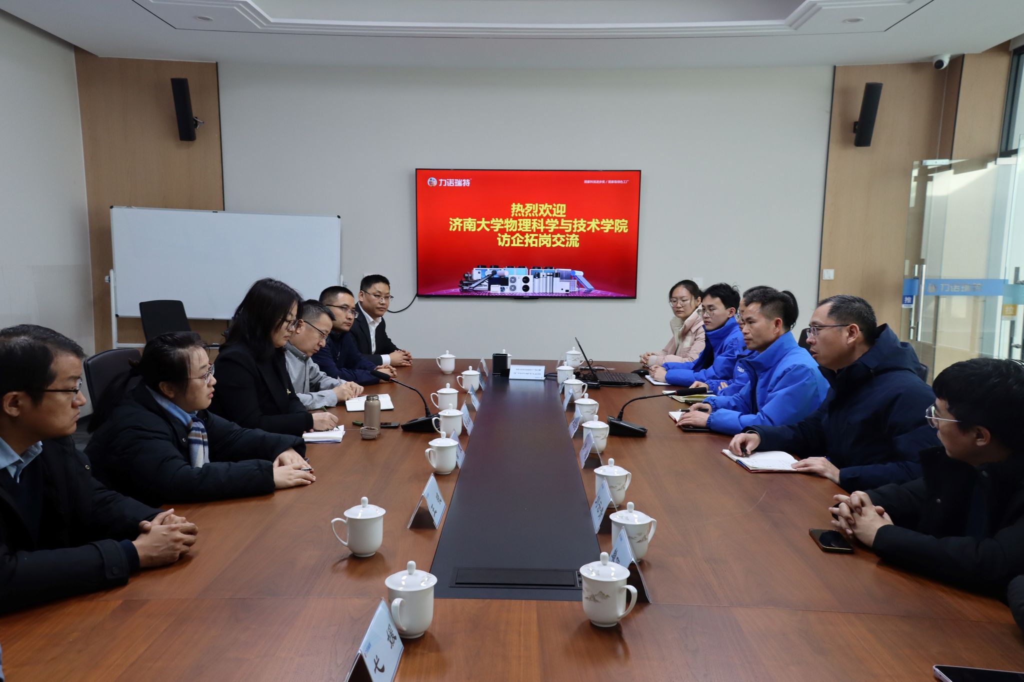 在九章(济南)量子技术有限公司,公司总经理徐佳敏、副总经理楼小永、校友代表参会,双方就量子未来技术研究院建设、专业培育、就业实习等方面问题进行洽谈。
