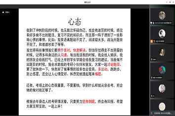 此次经验交流会为大三大四的同学们提供了交流的平台,方便了同学们对考研的前景、具体流程等的进一步深入认识。交流会开始之初,部门召集大三、大四心灵使者,呼吁大家积极参加并将腾讯会议号和二维码发给同学们。研究生学长学姐们提前准备好各自实际所需ppt和文档,先就自身经历和具体情况先解决大家普遍关于考研比较基础的问题,详谈如何做好详实可行的考研计划,及研究生期间的课程设置和发展前景,其次针对同学们可能出现的心理焦虑和时间管理谈谈自己的考研经历和学习方法。尽管是线上,同学们依然全神贯注地听,像榜样学习,结合自身思考着接下来的计划。研究生学长学姐们介绍结束,会议进入互动环节,同学们与学长学姐进行进一步交流。最后,主持人进行总结,宣布会议结束。若同学们仍有疑惑,可留下联系方式会后继续交流。同学们觉得此次会议意义重大,干货满满,大家调整好心态继续昂扬斗志地朝自己的目标前进。
