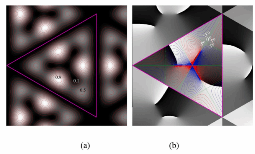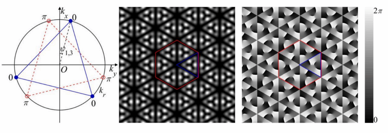2 a) 六束准对称平面波的横向傅里叶分量的排布及相对初始相位;(b)、(c)六束准对称平面波干涉形成的三角形高拓扑荷光学涡旋阵列的强度分布及相位分布。