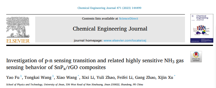 1. Xixi Li, Xiao Wang*, Yuli Zhao, Tongkai Wang, Yao Fu, Feifei Li, Gang Zhao, Xijin Xu*,CoP decorated SnS2 nanosheets with synergistic electronic and electrocatalysis sensitization for enhanced room temperature NO2 sensing, Sensors & Actuators: B. Chemical 389 (2023) 133883
