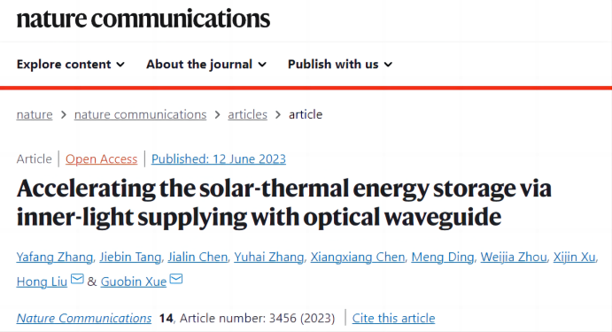 世俱杯sjb官网教师张亚芳、薛国斌等人在光波导内通光加速太阳能相变蓄热研究方面取得进展,相关成果“Accelerating the solar-thermal energy storage via inner-light supplying with optical waveguide”发表在6月份的nature communications杂志上,青年教师张亚芳博士为第一作者,薛国斌、刘宏教授为通讯作者,世俱杯sjb官网为唯一作者单位。