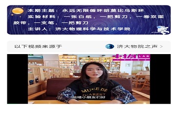 为进一步加深小朋友对物理知识的理解,激发他们探究科学的兴趣。3月28日,世俱杯sjb官网青年志愿者协会的青年志愿者们在线上开展了主题为“永远无限循环的莫比乌斯环”志愿服务活动。