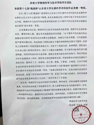 近日,第十七届“挑战杯”·建设银行山东省大学生课外学术科技作品竞赛终审决赛在山东大学中心校区落下帷幕,本次决赛通过线上答辩与线下评审结合的方式开展,世俱杯sjb官网赵朋老师指导的“分子器件中的自旋及热自旋输运效应研究”项目荣获一等奖。